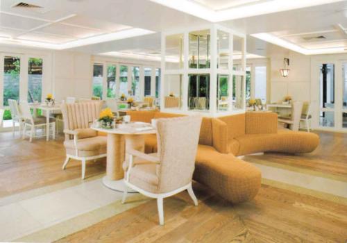 沒有窗戶的大廳使得室內(nèi)和室外之間的動(dòng)線更加流暢。象牙白木料與條紋式樣的家具呈現(xiàn)出一個(gè)前衛(wèi)時(shí)尚、富于異國情調(diào)的空間形象。