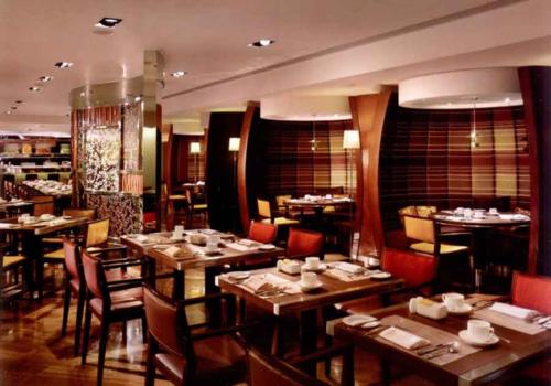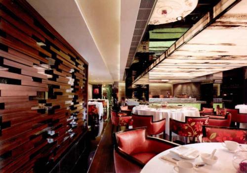 中餐廳和日式面吧的天花設(shè)計同樣巧妙,天花鏡下以半透明的大型發(fā)光燈箱作為裝飾,大大提高了室內(nèi)空間感,酒店設(shè)計公司更以中國傳統(tǒng)的水墨圖案點綴燈箱,隱隱地滲透出優(yōu)雅的詩意。