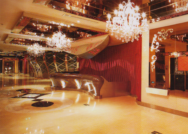 進(jìn)入梯斤,首先映入眼簾的是黑色吊頂配以無數(shù)白色及茶色的圓形天花,置身其中仿佛無邊無際,心曠神怡。靜態(tài)等候區(qū)弧形鏡面不銹鋼沖孔吊頂界定出了過道與大斤的功能性,大廳中兩根結(jié)構(gòu)柱上,設(shè)計(jì)師借以古代“鼎”之形體,加以具有現(xiàn)代質(zhì)感的玫瑰金不銹鋼鐳射切割圖案為裝飾材料。加上吊頂暗沉的茶鏡上噴不規(guī)則磨砂條,在定制水晶燈燈光的映襯和閃光燈爍下,光芒四射,呈現(xiàn)出重疊、錯(cuò)位和偏離的錯(cuò)覺,營(yíng)造出奇異的視覺效果,使人仿佛置身于幻象之中。