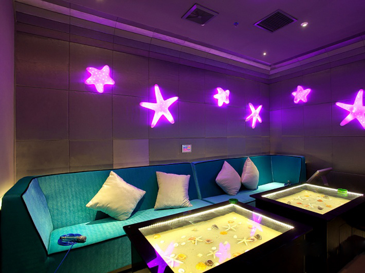 KTV設(shè)計(jì)裝飾造型多以流線形出現(xiàn),地面的用材猶如沙灘般的層次效果,休息區(qū)則讓人仿若置身于奢華游艇之中,天花上的魚群有迎賓之意,把客人引導(dǎo)至各空間,而進(jìn)入走廊時(shí)仿若進(jìn)入海底世界的夢(mèng)幻。進(jìn)入房間眼前則呈現(xiàn)有海星的浪漫、游艇的奢華。營(yíng)造了一種在度假中的娛樂(lè)氛圍。