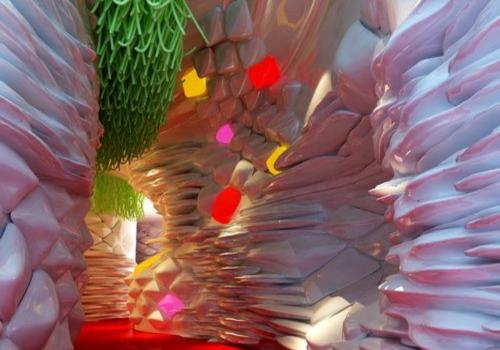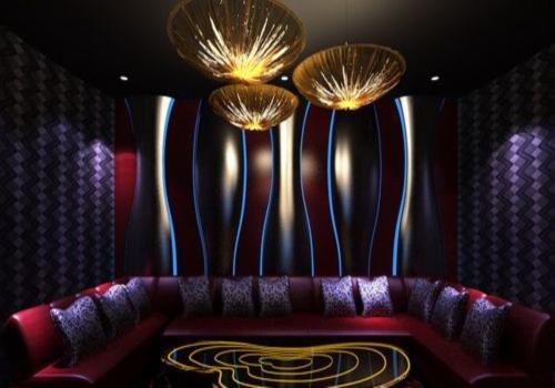 該案例在空間布局上的創(chuàng)新點(diǎn):過道的頂面與包房的墻面融合在一起,使墻面和頂面成為整體。同時采用視覺錯視的手法,形成整圓的怪圈造型。