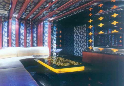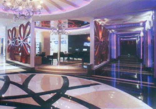 酒吧設計以奶白色為主色調(diào),大堂天花特高,造型新穎。當中的一個咖啡座,設有上網(wǎng)區(qū),兩邊各有兩朵大紅色花型裝飾,與天花的大紅花鏡面造型相輝映,白中透紅,讓人眼前一亮。