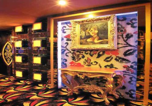 為了襯托音樂會所設(shè)計迷離的主題,設(shè)計師在進(jìn)行設(shè)計的時候,對燈光的運(yùn)用精妙絕倫,延伸到每個裝飾角落的LED燈不斷地變幻著自身的色彩,在間歇性的規(guī)律變幻中將一種迷離的色彩蔓延到空間的每個角落。