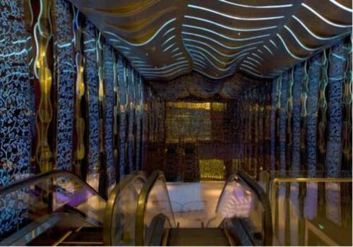 經(jīng)過時空隧道來到B1F等候大廳,KTV設(shè)計的激情被流暢的三維水波光墻及水晶般的燈效水波浪潮一層一層流動著,粹煉的更加精湛。墻面飾材以云石透光片及LED燈波浪潮特效搭配,天花燈效以金屬簾及LED燈的柔性如水波般波亮閃動著。