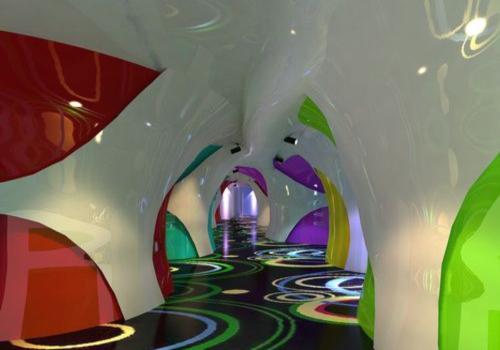此KTV設計過道的頂面與包房的墻面融合在一起,使墻面和頂面成為整體。同時采用視覺錯視的手法,形成整圓的怪圈造型。