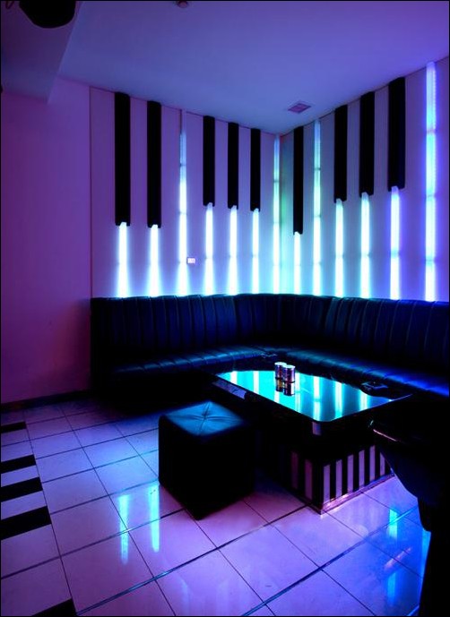 一個由鋼琴作為設計元素打造的KTV包廂空間,KTV設計效果圖展示出一個獨特的KTV包廂空間。