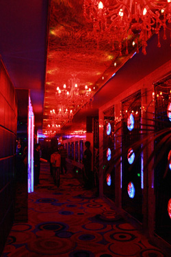 (5)KTV走廊燈光設(shè)計(jì)中可以結(jié)合裝修鑲嵌水晶條,水晶條內(nèi)部或側(cè)面布置LED燈光,這樣的燈光設(shè)計(jì)通??梢援a(chǎn)生內(nèi)透光效果,也可以設(shè)置七彩變色等多種效果。