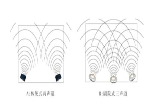 第一、能夠使聲音的密度感更好,聲場更加寬闊,能夠很好的營造出臨場感和現(xiàn)場氣氛,傳統(tǒng)模式和三聲道模式的聲場比較示意如圖(方框區(qū)域代表房間,曲線代表聲波的傳輸):從圖上分析明顯可以看到,采用三聲道方式后,聲場的均衡度大大增加,聲音的能量也得到了增強。