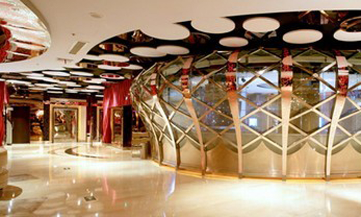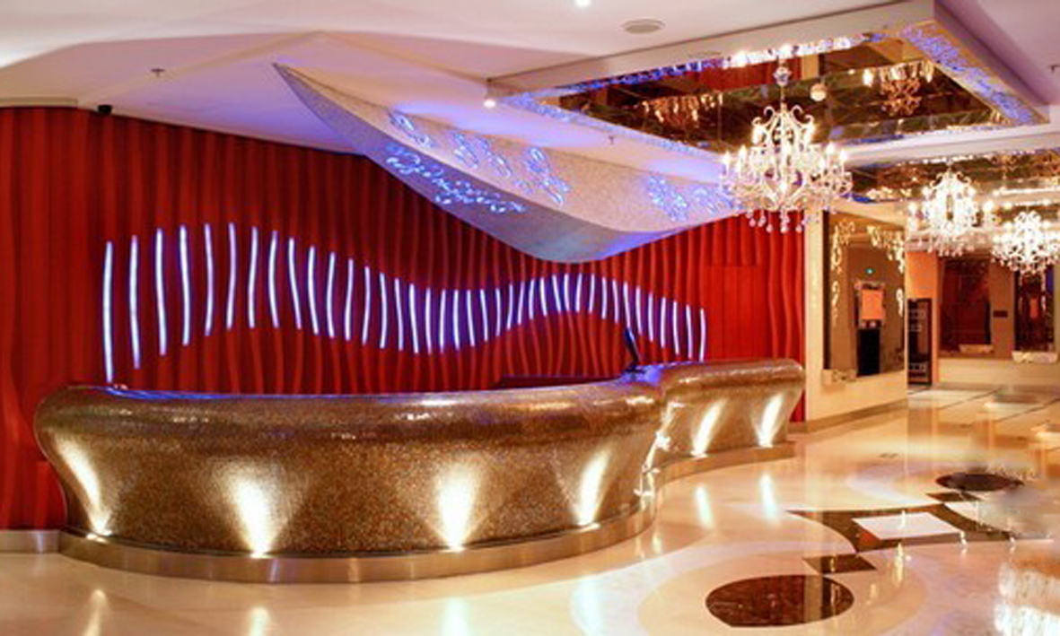 這個(gè)KTV設(shè)計(jì)的最亮點(diǎn)是借用現(xiàn)代科技,使原本方正的鏡面不銹鋼,經(jīng)過鐳射沖孔,加上七彩LED及不規(guī)則熱彎清玻璃,精誠(chéng)天工般的塑造成象征權(quán)力最為尊貴之奢侈品--皇冠(超豪華總統(tǒng)包),14根“眼鏡蛇”形鏡面不銹鋼沖孔立柱,加上48顆36面精切水晶(立柱間交叉點(diǎn)),透出七彩燈光,猶如飄浮在空中上的豪華宮殿。6/7F挑空區(qū)不同大小的玫瑰金鏡面不銹鋼圓環(huán)扶手,層層疊疊,醉醉醒醒,這可能就是設(shè)計(jì)師想要達(dá)到的效果吧!玻璃幕墻內(nèi)部布滿數(shù)以萬計(jì)的點(diǎn)狀七彩LED燈,形成一片光墻,透過鋁制金屬簾照射出來,仿佛透出了震憾,李白有詩(shī)曰:飛流直下三千尺?。?!