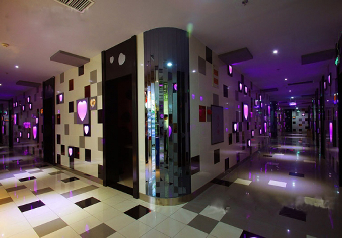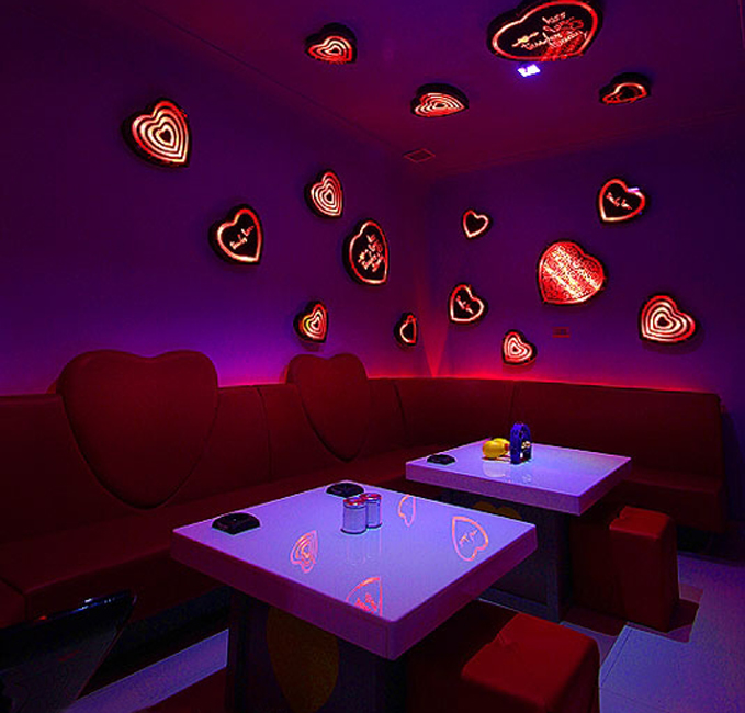 音樂之聲氧吧KTV是現(xiàn)代風(fēng)格的理念,多采用現(xiàn)代幾何造型,以桃心型為主,方塊造型為襯托,設(shè)計在外觀招牌,大廳的翻天覆地,走道的天地墻,房間門的圖案及拉手,以心為主題的房間等,讓人置身于浪漫的桃心世界。