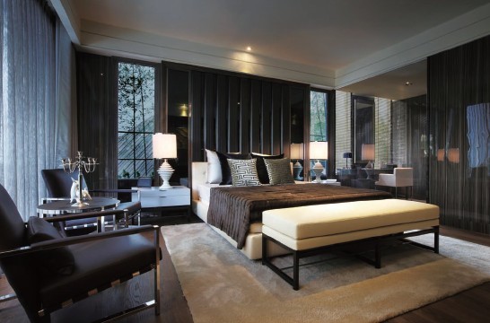 在這里,設計師再次以大山大水作為意象,此處的設計重點是通過壓縮廊道的寬度和高度,把藝術品置入兩側,平衡人行走的尺度。墻面基調采用的灰色鏡面材質同樣被運用于此,走進去一股禪韻之意油然而生,原本煩躁的內心頓時安靜下來,感官如入定禪僧般靜默不語,慢慢的,靜靜的,解放于其他空間,讓廊道成為名副其實的量體中軸。