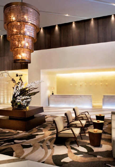 在入口處安放了低座組合沙發(fā),樣式新穎的凳子以及優(yōu)雅的弧形休閑椅,客人坐在這里,猶如置身于仙境一般,美麗的城市風(fēng)景和海灣風(fēng)光一覽無遺。座椅區(qū)的背景墻是鑲有垂直木鰭的背光玻璃墻,地板上鋪了印有清晰圖案的泰國長絨毛毯。