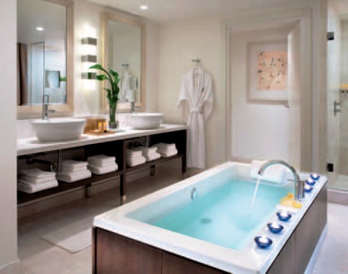 一樓大廳沿著兩側(cè)有腳燈交替照明的石灰石走道向前走,客人會看見一面4.9 m厚的玻璃玄關(guān)墻,其上裝有水平胡桃木窗。穿過玄關(guān)門進(jìn)入大廳,客人會立刻感受到洗浴會所的壯觀。大廳天花板的高度為8m,大廳中所有的玻璃墻前都裝飾有軟質(zhì)輕薄的窗簾,自然光線透過窗簾,使整個大廳明亮又通風(fēng)。