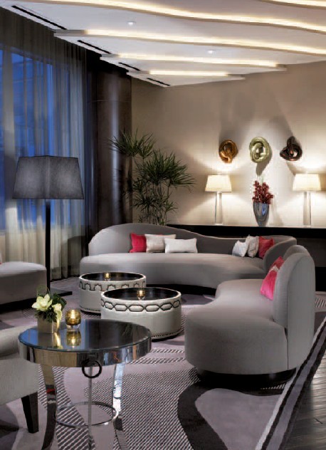 當(dāng)客人們走向白色縞瑪瑙前臺時,他們會經(jīng)過一個精美的現(xiàn)代木桌,抬頭看上方,映入眼簾的便是天花板上懸掛的大型多層角狀水晶吊燈。在登記臺后面,有一個同色系配色的威尼斯式灰泥墻,其上展示了定制的雕塑淚珠。在休閑椅區(qū)上方有很多亮晶晶的矩形玻璃吊燈,大小不一、形狀各異,表現(xiàn)出一種微妙的韻律美。