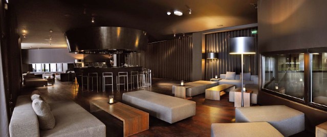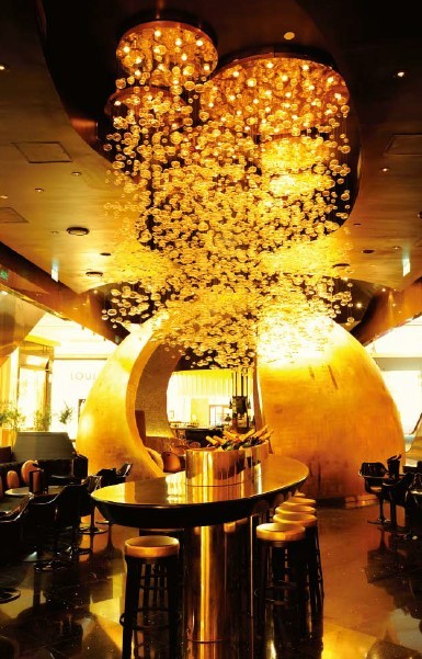 位于會(huì)所中心位置的金色球體外部覆有18Ct金箔,流光溢彩的內(nèi)部則以玻璃球石鑲嵌而成??諝庵袕浡鴥煞N不同香檳酒的芳香,華麗的酒吧環(huán)境為客人帶去多重感官體驗(yàn)。