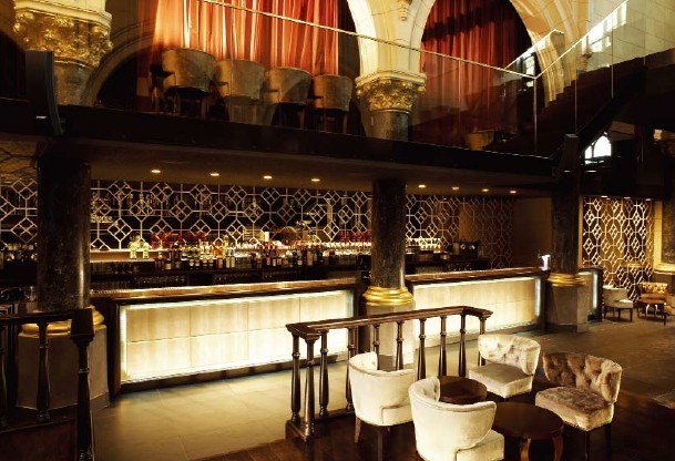 以前是一座圣公會教堂,會所設(shè)計公司保留了諸如拱門、挑高吊頂及奢華枝形吊燈等教堂原有的哥特式建筑元素,水晶、鍍金以及各種材料的混搭組合等,又為它的現(xiàn)代化設(shè)計定下了基調(diào)。以絲絨和皮革制成的奢華家具極具維多利亞風(fēng)格。會所設(shè)計公司巧妙地利用鍍金工藝,將金色的金屬樹葉裝飾在木料、石料及金屬等材質(zhì)的表面,盡顯精致細(xì)節(jié)。