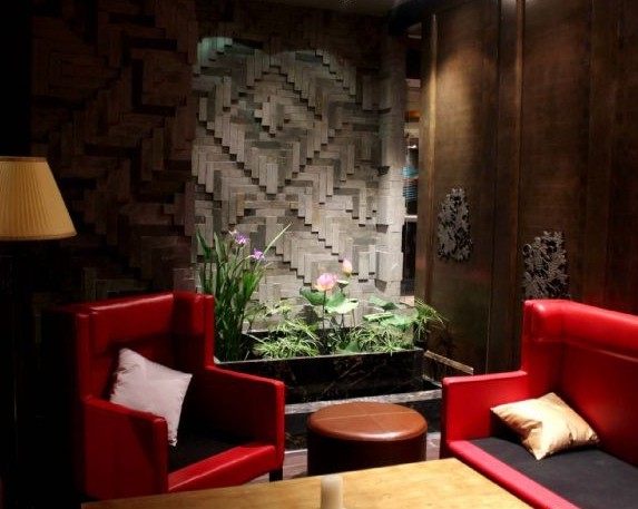 威士忌酒吧沿用了“平湖秋月”的主題。天與地,山與水的意念通過(guò)天花的云彩造型,墻上掛毯的山體形態(tài),地毯的水紋等表現(xiàn)出來(lái)。另一面墻上是斗拱立面形態(tài)的圖案,這個(gè)中國(guó)古建筑的傳統(tǒng)元素被穿插在“朗”會(huì)所不同的空間里作點(diǎn)綴,暗示著中國(guó)風(fēng)的格調(diào)。酒吧間設(shè)有特意設(shè)計(jì)的書(shū)架,供客人坐在沙發(fā)上靜心閱讀。書(shū)架的形狀設(shè)計(jì)和吧臺(tái)側(cè)面的透光圖案都采納了傳統(tǒng)的嶺南窗花紋路,凸顯出本地文化特色。