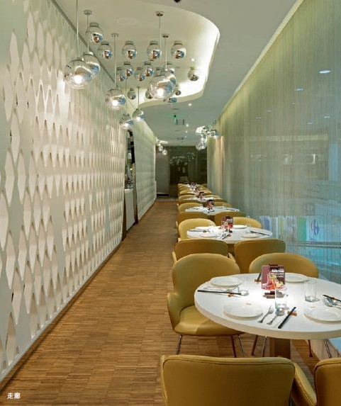 吧臺(tái)的對(duì)面是一個(gè)大玻璃盒子, 內(nèi)部為一條通往地下層的輸送帶型扶梯, 在餐廳里可以透過(guò)玻璃看見(jiàn)雙向流動(dòng)的人群, 呈現(xiàn)了《未來(lái)世界》電影情節(jié)中的黑色幽默。