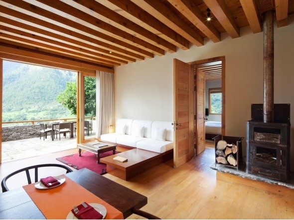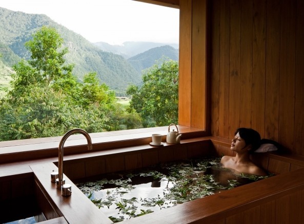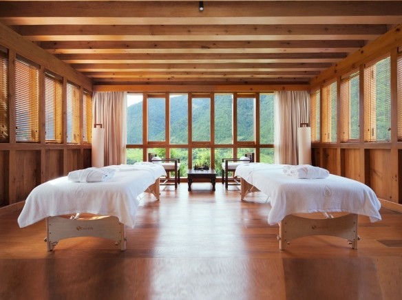 以簡約流暢的線條演繹著經典奢華的氣息,偌大的睡床、柴燒式爐灶和平靜中性色調的客房,加入不丹風情的傳統(tǒng)鮮艷手繪墻身,成為 Uma Punakha 水療洗浴中心設計亮點。