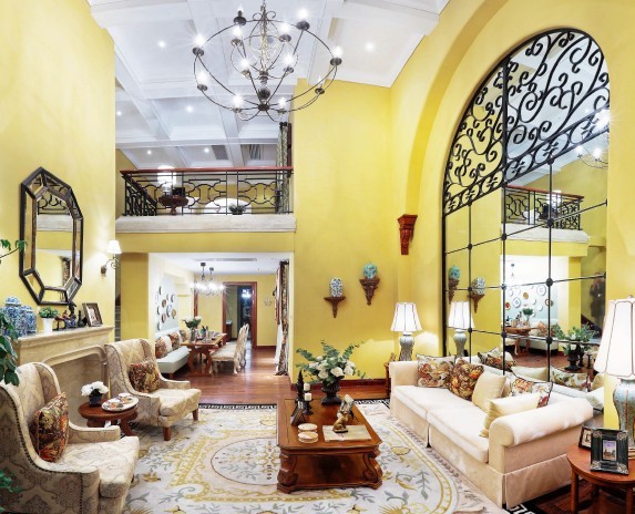 整個(gè)空間不論是地毯、壁紙、窗簾,還是其他陳設(shè)藝術(shù)均使用了各種各樣的花紋圖案,這絕不僅僅是一個(gè)花園,這更像是一個(gè)私人百花莊園,目之所及處皆可見(jiàn)薰衣草、白玫瑰。在選色上,選擇直逼自然的柔和色彩,在私人會(huì)所設(shè)計(jì)上注重空間的相互利用,充分利用每一寸空間,同時(shí)也不顯局促、不失大氣,成就了開放式自由空間的絕美樣貌。在地中海風(fēng)格家具的布置上,集裝飾與應(yīng)用于一體,使之散發(fā)出古老尊貴的田園氣息。