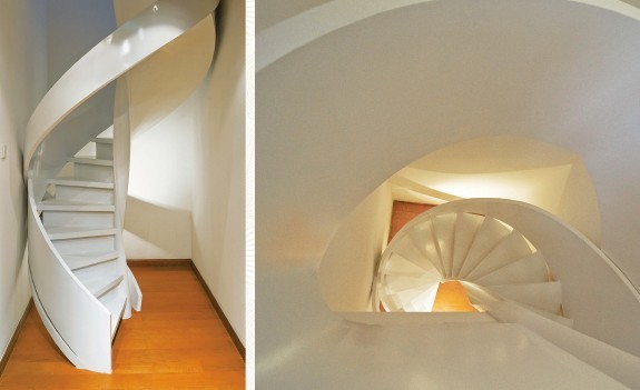 地下層的起居室與外部的庭院有密切的關(guān)聯(lián),軟木鋪地透過(guò)玻璃門通向庭院,幾何形的黑色鐵盒內(nèi)鋪白米石,一片草地,綠色的樹(shù)木,加上墻面鏡子的反射,透著幾分綠意,空曠的景色融入一片于片生機(jī)盎然的自然美景中。