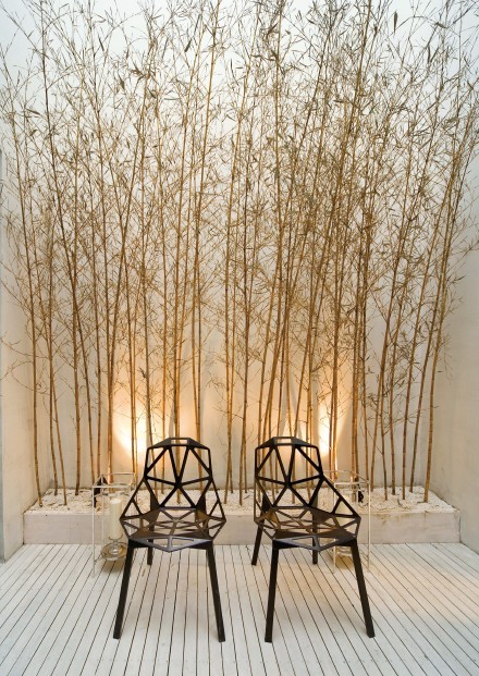 白色隔板上的綠色植物工整地排列在高墻之上,白色的墻面映襯著蔥郁的植物,使庭院充滿生機(jī)。