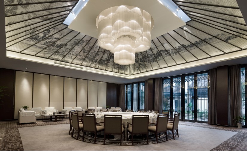通過曲橋、連廊、庭院有機地將這些分散的獨立空間銜接起來,整體錯落有致、層次分明。項目共有豪華包廂20個、大小會見廳2個,大型會議室1個、就餐大廳1個,空間特色分明,裝飾風(fēng)格尊貴大氣。