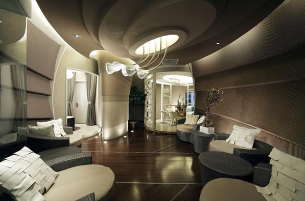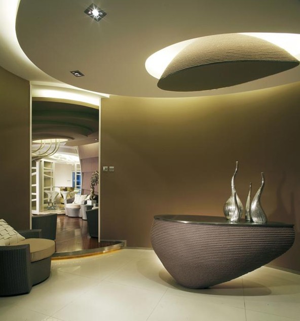 在本案的設(shè)計(jì)中“繭”是整個(gè)方案的主題關(guān)鍵詞,從字面意思來(lái)看繭給人的感覺(jué)就是層層包裹。私人會(huì)所設(shè)計(jì)公司從具象與意象出發(fā),大量運(yùn)用圓形和橢圓形的幾何元素來(lái)充斥“繭”空間,同時(shí),對(duì)“合圍”、“纏繞”這兩個(gè)造型元素的表達(dá)也不是一成不變,它可以是簡(jiǎn)單的圓形墻,也可以是由鏤空的大斜紋網(wǎng)狀圍欄來(lái)體現(xiàn),也可以是由層層鋪排的弧形飾面板組合而成。