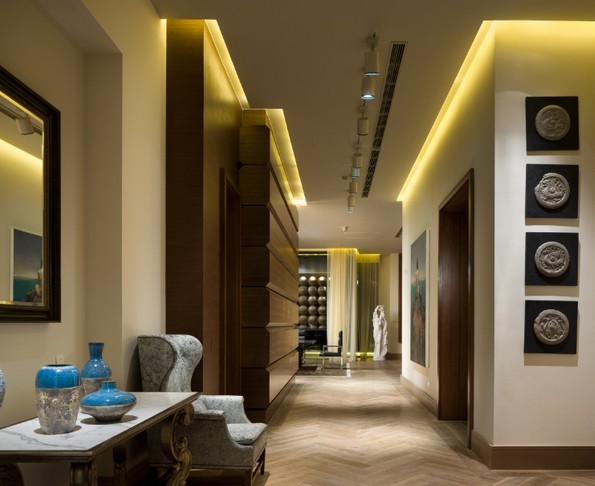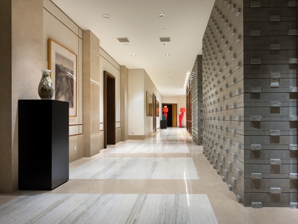 室內色調摒棄了鮮明的冷暖感受和彰顯個性的純色應用,而主要采用中性色調,期間穿插運用了駝色、金色、銀灰、 深褐色、營造出高端、典雅和奢華的視覺效果。同時在裝飾圖案方面,設計在多處運用了具有中國古典特色的大紅與金黃。天花、地毯、墻面裝飾、甚至是沙發(fā)靠墊都相互呼應、相互襯托,為空間氛圍的營造提供品質的體現(xiàn)。