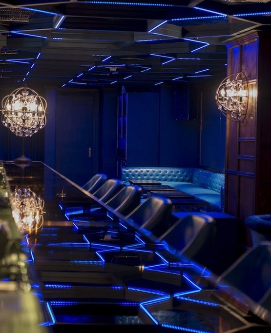 深藍(lán)是整個(gè)俱樂(lè)部設(shè)計(jì)的主色調(diào),藍(lán)色既有古典的憂郁又有夜的深邃,在這里每一個(gè)夜晚都是天堂。迷人細(xì)部的綠松石色休息沙發(fā)沿著空間一字?jǐn)[開(kāi)布局,寬敞的休息室、特殊的天花板,更吸引人的是LED先進(jìn)高清視頻屏幕,時(shí)刻為您播放不同的驚喜。