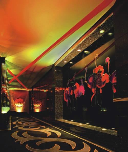 夜總會(huì)位于商務(wù)客房樓的二三四層,每層的定位很明確,二層迷離斑斕,大量使用金屬、玻璃、鏡面以及七彩幻變的LED光源塑造奇幻迷離的視覺效果。三層神秘瑰魅,借助經(jīng)過特殊訂制的雕塑、琉璃裝置來講述一個(gè)個(gè)神秘撩人的故事。四層夜總會(huì)設(shè)計(jì)高貴奢華,則通過黑色水晶、黑色真皮、七彩光纖營(yíng)造高貴奢華的氛圍。“紅”色主題不斷出現(xiàn)在各個(gè)區(qū)域,以不同的姿態(tài)。不同的特質(zhì)盡情宣泄若燃燒的欲望,設(shè)計(jì)師希望通過各種不同類型的材料,紛繁復(fù)雜的工藝來挑戰(zhàn)自己的駕馭能力。