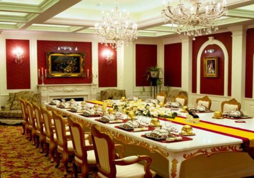 歐式餐廳作為一個(gè)舉行盛大聚會(huì)的地點(diǎn),在滿足使用的功能,鋪上了大理石墻裙,選用特制的水晶燈,映射出燦爛的光芒。主導(dǎo)色彩是紅色和黃色——羅馬的顏色。墻壁,以織物封套的面板做簡(jiǎn)單的裝飾。用來(lái)作為密友進(jìn)餐時(shí)背景和藝術(shù)收藏品。融合了著名的羅馬珠寶商以及更為傳統(tǒng)的皇室設(shè)計(jì)風(fēng)格,擺滿了法國(guó)和意大利經(jīng)典銀制餐具。色彩選用了比較國(guó)際化的標(biāo)準(zhǔn),主要是較暖的中色調(diào),如:古銅,淡金,熟褐和猩紅。營(yíng)造出一種能夠激發(fā)永恒的時(shí)代感與典雅的歐式經(jīng)典風(fēng)格。