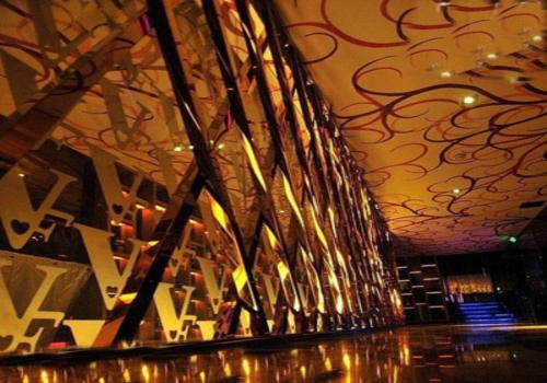 在“市場(chǎng)為源”這方面,會(huì)員區(qū)使用最新的時(shí)尚裝飾材料,如黑透亞克力、玉花白亞克力、大理石雕花圖案、帶暗格的布衣等。燈光上稍稍明亮些,讓客人可以自由地進(jìn)行商務(wù)交流,使其保持明朗的心情。在“效果為本”這方面,大量使用“自發(fā)光的材料”做成球體、盒體、七字形等,還大量使用了人造鉆石,透光并且形成花形圖案,不但營(yíng)造了不刺眼的、溫暖的燈光氛圍,還兼顧了流行和時(shí)尚的語言。門的做法是將薄如紙片的燈片夾在鏡子里形成別具一格的整體雙面發(fā)光效果,產(chǎn)生墻面鳥巢形體的負(fù)形體。