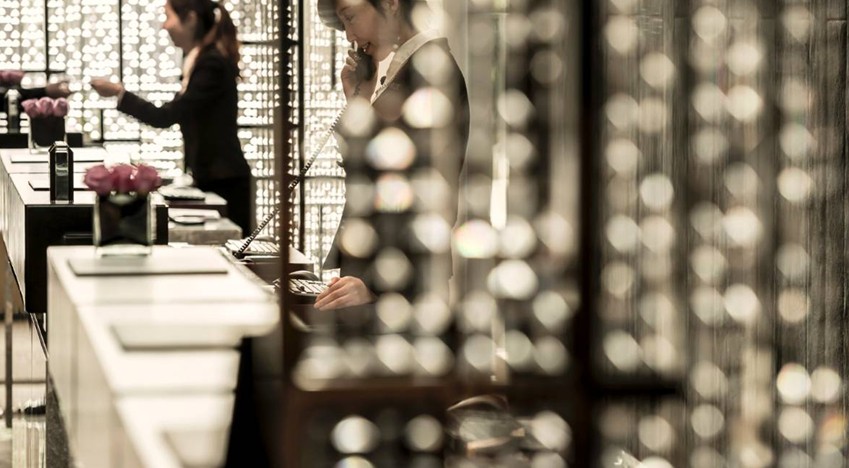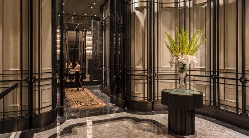 甫進大堂,首先映入眼簾的是造型感十足的螺旋梯,富有光澤的理石梯面與黑檀木制把手生動地雕琢出蜿蜒而上的造型。螺旋梯頂端可見日本設計團隊打造的由1000條金屬薄片編織而成的巨型吊燈,好似葉片的形態(tài)使原本笨重的材質顯得格外輕盈,伴隨一天中不同時段的日照,金屬材質亦閃耀出不同亮度的光澤,十分悅目,成為酒店大堂一道爛漫的風景。