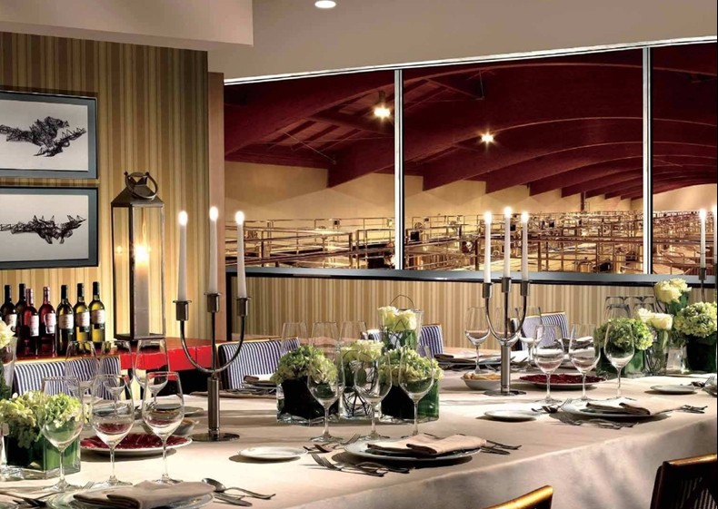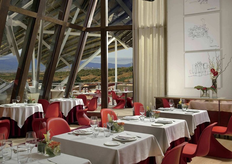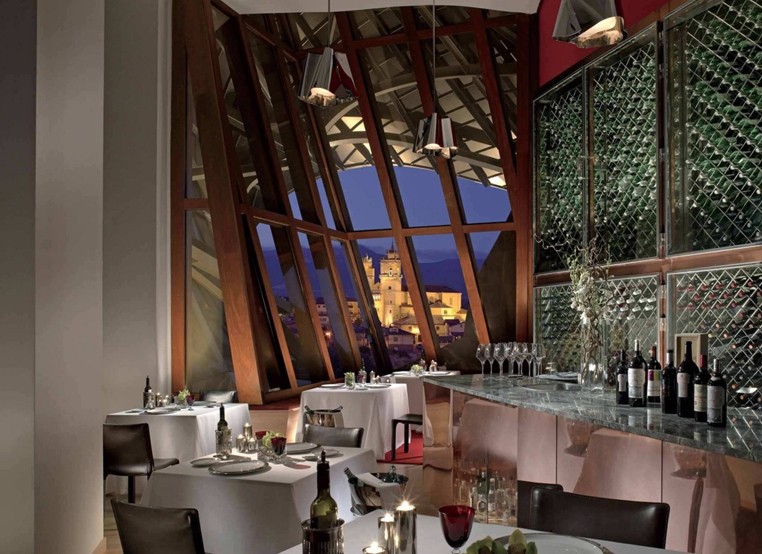餐飲會(huì)所位于酒店二層,置身于八百萬瓶窖藏葡萄酒之上,可由外部電梯直達(dá)。為了更好地凸顯葡萄酒質(zhì)地,餐飲會(huì)所動(dòng)用了暖意十足的紅色鋪陳地面,并以輕柔的紗幔配搭巨大開窗,賓客在豐富味蕾享受的同時(shí),可以眺望中世紀(jì)小鎮(zhèn)埃爾謝戈千年來未曾變化的“臉龐”.餐飲會(huì)所更以蓋里手繪酒店建筑方案的草圖作為裝飾畫作,將此地出位的建筑風(fēng)格再次強(qiáng)勢推出。