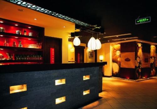 杭州新隆達洗浴中心的室內(nèi)設計則是似創(chuàng)新的設計手法,運用傳統(tǒng)地域文化符號,著力渲染室內(nèi)特有的中國味。無論是大廳中整個墻面點綴的以中國古代大門的麒麟頭飾,還是以“西湖醋魚”“干菜燜肉”“龍井蝦仁”等篆刻形式表現(xiàn)的照壁;無論是一層大廳滿是斗棋浮雕的裝飾墻,還是滿鋪地毯上的團錦紋飾,都共同體現(xiàn)了杭州地域性的特征。
