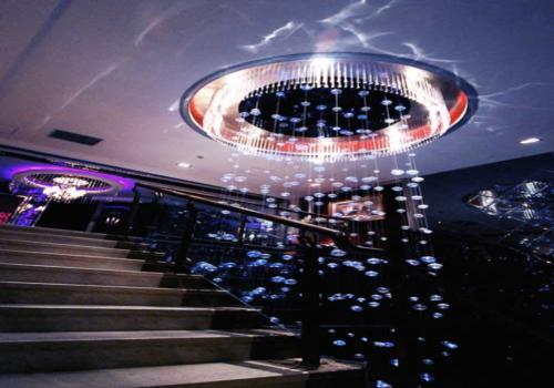 (二)方向?qū)Ρ?br /> ktv室內(nèi)環(huán)境設計中的方向?qū)Ρ?,常常表現(xiàn)在墻面的劃分上,如用垂直劃分強調(diào)高聳,用水平劃分強調(diào)舒展等。除此之外,還可能表現(xiàn)在不同方向的構(gòu)件之間,如傾斜的樓梯、自動扶手與垂直的柱子和水平橫梁的對比,平展的排椅與列柱式的燈柱間的對比等。兩側(cè)的列柱強調(diào)了垂直向上的方向,天花上的造型強調(diào)了水平延伸的方向,二者間的對比就是方向的對比。