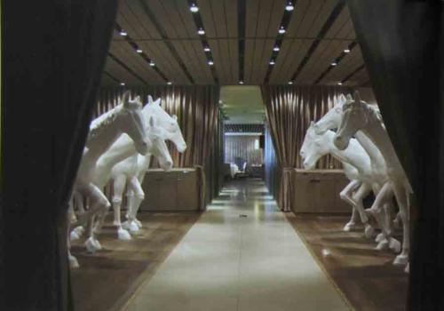 銅馬被做成了全白,沒有韁繩的白馬恢復(fù)了天生的靈性和自由,八匹真實(shí)比例的奔馬在整個(gè)略點(diǎn)陰柔氣息的環(huán)境中起到了平衡作用。而馬身上的蘭花裝飾則又帶有一點(diǎn)戲謔和后現(xiàn)代的味道,削弱了動(dòng)勢(shì)極強(qiáng)的奔馬所帶來的力量感。餐廳中的墻面使用手工拉成細(xì)絲的松木和蘇州絲綢作為裝飾材料,這種極具復(fù)雜的工藝重新詮釋了中國傳統(tǒng)材料,帶著歷史的滄桑、時(shí)間的厚度、手工的溫暖迎面而來,倍感關(guān)懷。在中式風(fēng)格設(shè)計(jì)橫行的時(shí)代,這樣的項(xiàng)目作品值得我們鄭州裝修公司去學(xué)習(xí)。