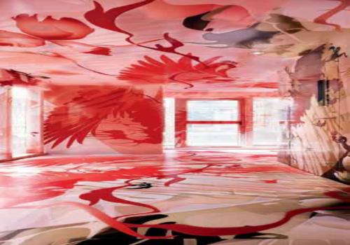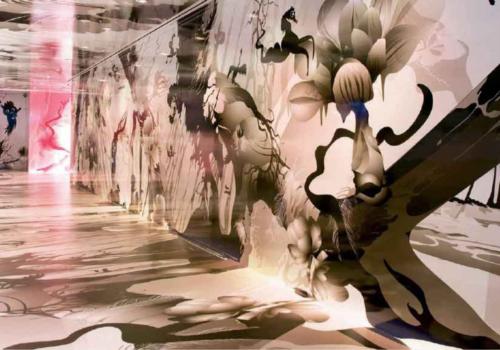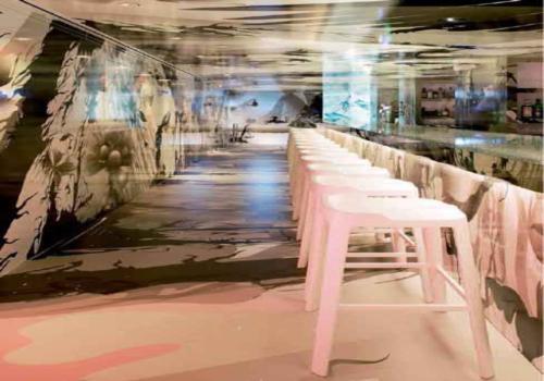 設(shè)計(jì)師通過最先進(jìn)的3M風(fēng)格影片在室內(nèi)墻壁上演繹Olina超現(xiàn)實(shí)世界的插畫表現(xiàn),3M是一家材料廠家,冰島的Reykjavik博物館85米的墻壁裝置就是它與Olina攜手的杰作。