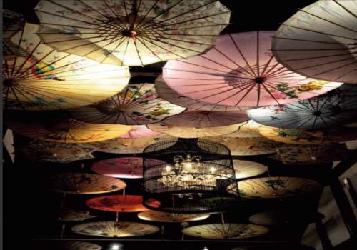 墻身裝飾用了大量實(shí)物畫和與酒店興建過程息息相關(guān)的照片,讓西餐廳與整個(gè)酒店“血脈相連”。在自助餐區(qū)域我們用了大量的彩繪油紙傘高低錯(cuò)落地倒掛,進(jìn)行天花裝飾,展現(xiàn)了個(gè)由序列和變化產(chǎn)生的心理震撼效果。在畫里傘間,我們還吊掛了團(tuán)隊(duì)自行制作組裝的主光源吊燈--“籠中的奢華”,立意制造個(gè)中式外殼西式內(nèi)在的物件,具體是用個(gè)個(gè)多節(jié)的鳥籠漆成鐵黑色,里面安裝個(gè)鍍金的水晶吊燈,整體吊掛于天花上。