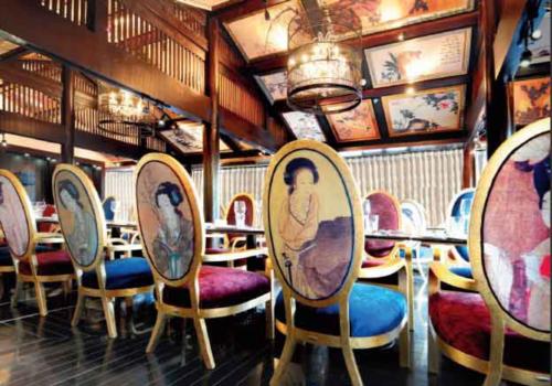 西餐廳的椅子是舒適的歐式金箔外框布包椅子,然而每把椅子的背后裝飾都有位可考究的中國(guó)古代才女佳人畫像,或仰望,或顧盼,千姿百態(tài)。西式的外殼背后卻隱藏著中式的韻味,與之前的“籠中的奢華”手法,可謂是角色互換。中西巧妙合璧的設(shè)計(jì)手法值得我們鄭州裝修公司鑒賞學(xué)習(xí)。