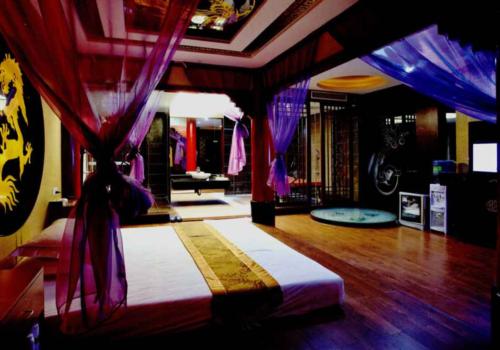 中式客房自然少不了典型的中式元素,古典花格、北京銅門釘、龍造型玻璃、龍床及線簾和水晶珠簾打造出一個大氣優(yōu)雅、極富文化內(nèi)涵的空間。如此多樣化的設(shè)計元素相融合的手法需要我們鄭州裝修公司鑒賞學(xué)習(xí)。