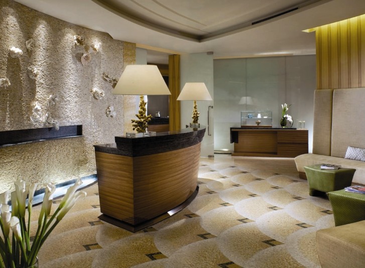 地面一般提倡無(wú)高差、無(wú)阻礙設(shè)計(jì)。若由于洗浴中心建筑的原因或局部造型或陳列內(nèi)容的需要,有高差級(jí)別的,應(yīng)在高低差間運(yùn)用有區(qū)別的材料、色彩、或設(shè)計(jì)不同圖案作勾邊處理提醒人們注意,防止摔倒。現(xiàn)代洗浴中心地面采用的材料常用的有大面積鋪貼的磨光大理石花崗石板、拋光地磚、耐磨亞光地磚等。這類材料耐磨、光澤度和易清潔性能較好,但要注意防止不要把水倒在上面,以防顧客不慎滑倒。國(guó)外洗浴中心設(shè)計(jì)甚至還有大面積采用地毯,地毯的吸聲、吸塵、彈性好,行走時(shí)不易疲勞,但清理、耐久性略差。洗浴中心的地面設(shè)計(jì),公眾共享空間的地面一般都比較豐富和富有個(gè)性。