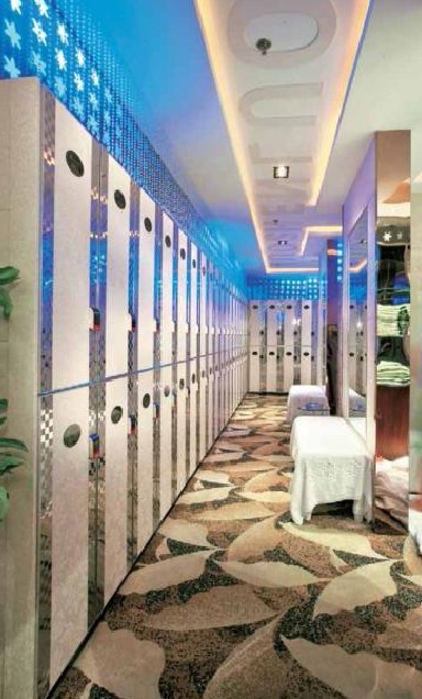 洗浴中心走道設(shè)計(jì)以導(dǎo)向性的小圖案增加情趣與變化,走道拐角處、交叉處、走道與扶梯交界處應(yīng)作分色處理或設(shè)計(jì)圖案,不但美化空間。