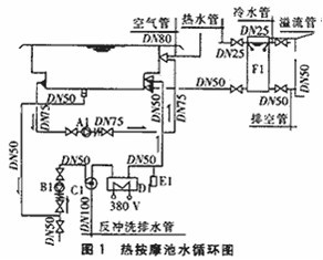 水力按摩池因水質(zhì)較游泳池差,其循環(huán)周期短,一般取15~20 min,過濾沙缸一般采用進(jìn)口小型沙缸,尺寸較國(guó)產(chǎn)碳鋼濾罐小,平時(shí)過濾、反沖洗等流程控制是通過沙缸頂部的多向選擇閥,方便簡(jiǎn)單,不像普通國(guó)產(chǎn)碳鋼濾罐那樣通過復(fù)雜的閥門控制,進(jìn)口過濾沙缸濾料一般采用細(xì)石英砂,濾速可達(dá)50 m/h 左右,按摩水泵流量根據(jù)按摩噴頭個(gè)數(shù)確定,按摩噴頭數(shù)根據(jù)浴池同時(shí)使用人數(shù)確定,水力按摩噴頭分為內(nèi)水型和外水型兩種,國(guó)內(nèi)桑拿洗浴中心設(shè)計(jì)內(nèi)水型用得多,其出水量根據(jù)產(chǎn)品樣本確定,一般平均出水量為2.30m3/h。為了保持浴池內(nèi)水量及水面穩(wěn)定,需設(shè)平衡水箱,考慮到過濾水泵及按摩水泵同時(shí)工作,一般平衡水箱容積不應(yīng)小于浴池容積。