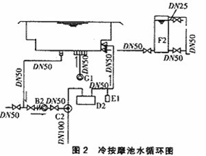 成品水力按摩池分成幾種規(guī)格,如1 座位,4 座位,5 座位,6 座位,8 座位,12 座位等,給排水設(shè)計(jì)較簡(jiǎn)單,只需按產(chǎn)品樣本要求接入冷熱水管即可;土建式三溫池可分為冰池、熱水池、溫水池,其工藝流程如圖1、圖2 所示。