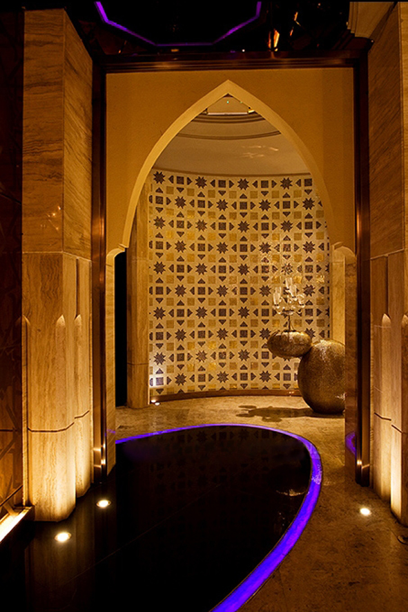 古樸而華麗的飾品、色彩豐富而夢(mèng)幻的異國(guó)情調(diào),充滿浪漫的溫情,用它來做為一個(gè)頂級(jí)私人會(huì)所的裝飾文化是再適合不過,通過伊斯蘭式的各種幾何紋樣, 設(shè)計(jì)成色彩絢麗的馬賽克及墻毯地毯,鏤空金屬銅板制作的裝飾燈,加入水晶吊燈來增添現(xiàn)代奢華感。通過對(duì)不同色調(diào)來區(qū)分房與房之前的不同感觀,可以用紫紅與綠來做出她的香艷與浪漫,也可以用土地色調(diào)表現(xiàn)其柔和的奢華。