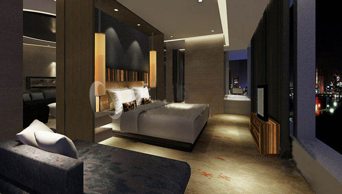 同時這些木質(zhì)家具、樓梯也從材質(zhì)和色彩上平衡了酒店公共空間中被大量使用到的大理石、玻璃、鋼筋等。就連客房中也大量使用了曲線元素,如弧形的浴室門。