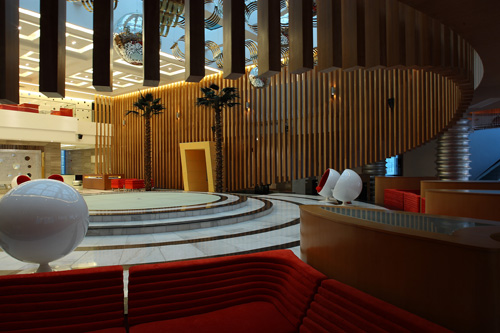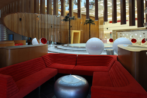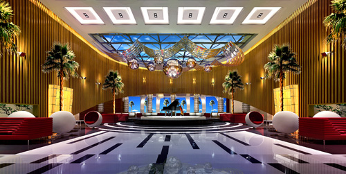 客人一走進(jìn)大堂,就置身于耀眼的光芒中,燦爛而輝煌。大理石特制的前臺(tái)將空間襯托得大氣磅礴,鱗次櫛比的弧形木條圍繞著大廳,圍出一個(gè)舞動(dòng)的空間,天花上鋼制的球形裝飾與設(shè)計(jì)師特別創(chuàng)意的鏤空?qǐng)A筒交相輝映。