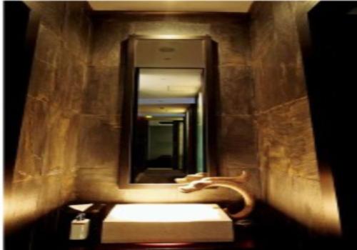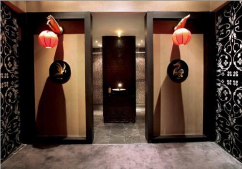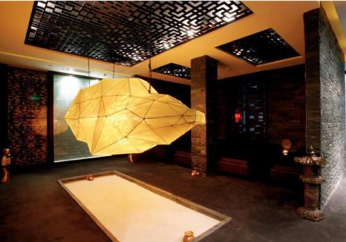 位于中央的區(qū)域同樣也有兩處從天花板頂部潺潺流下的瀑布,另外還有個時尚的大型中式吊燈。瀑布的水流聲營造出種靜謐祥和的氛圍,外形不規(guī)則的吊燈起到了區(qū)域隔斷的作用。同時給各空間提供了定的光照度。各個按摩房之間的墻壁實(shí)際上是兩層磨砂玻璃,中間夾放了中式的窗欞作為裝飾,隱隱約約的燈光在讓人放松的同時也傳遞著種神秘感。